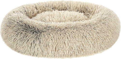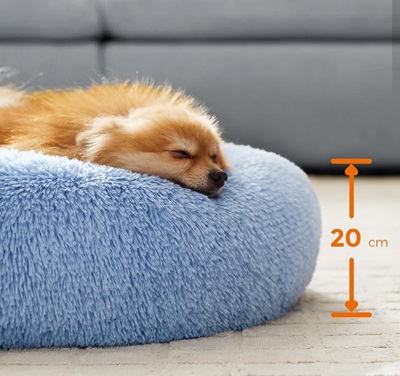 Las camas antiestrés (también llamadas camas tipo donut o nido) recrean exactamente esa sensación. Tienen bordes elevados y mullidos donde tu perro puede apoyar la cabeza, hundir el hocico o simplemente sentirse abrazado mientras duerme. Es como darle un abrazo constante que dura toda la noche.